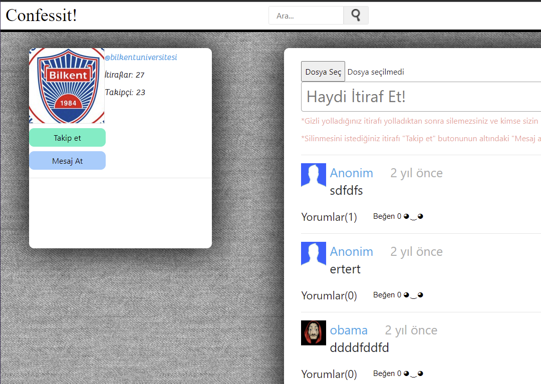 It is a web-based social network project. It's made by using HTML, PHP, JavaScript, MySQL. It includes messaging, notification, posting, profile, user search, settings, login, logout, password recovery, verified account system. The site allows you to post a confession anonymously to verified university accounts or users' profiles.
