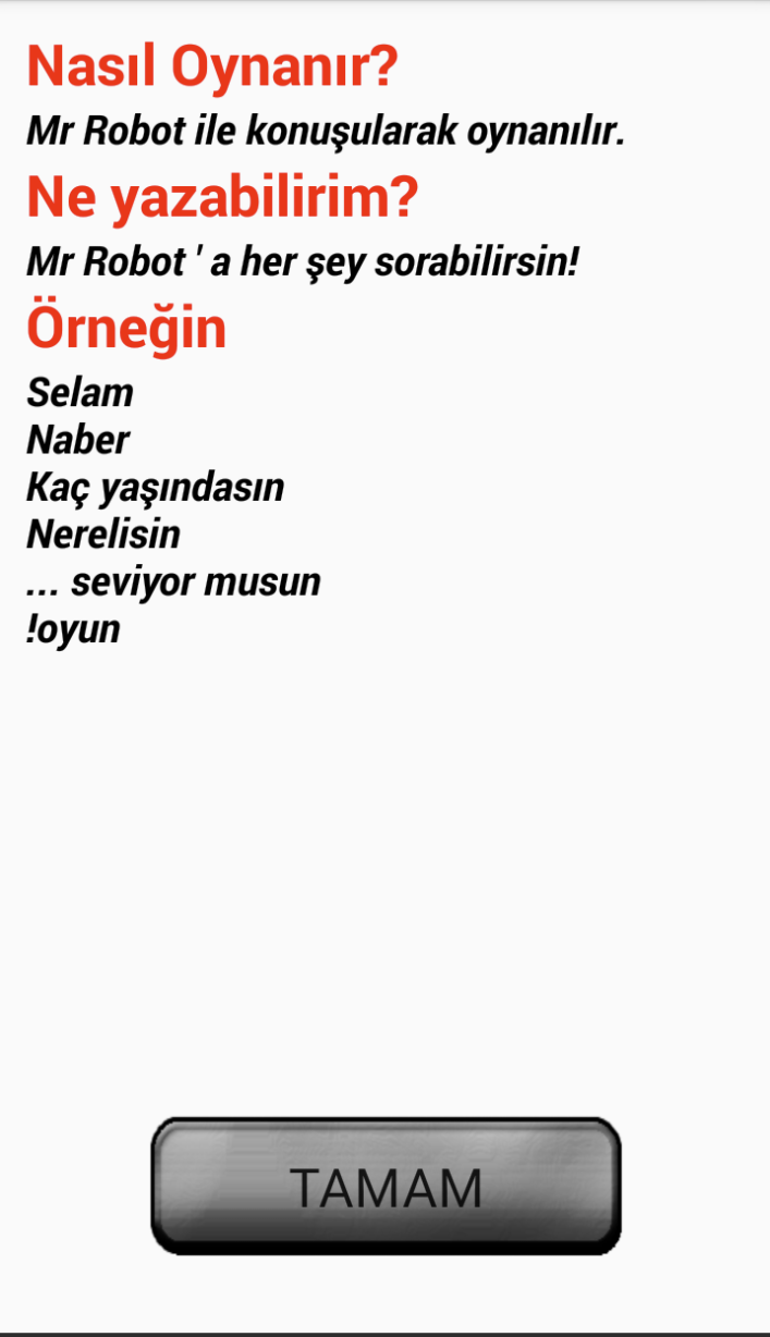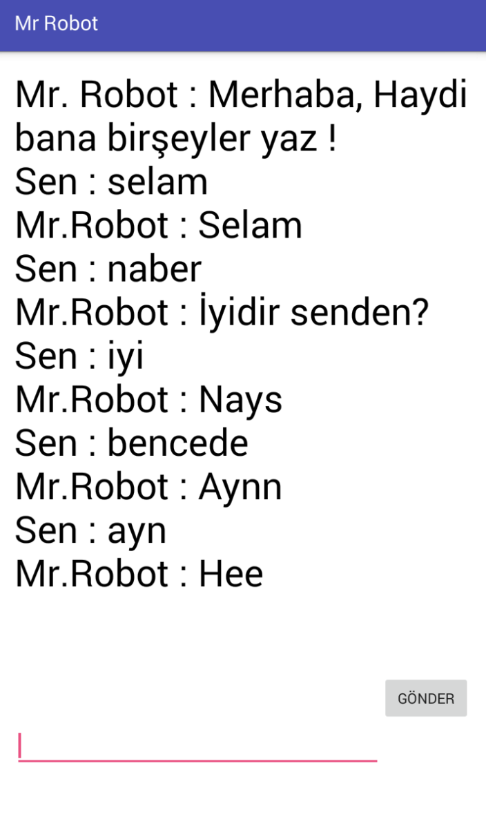 Mobile Chat Game developed by using android studio. Currently, it supports only Turkish. It is one of my first android applications. I joined a competition with this app in high school. The main aim is to chat with a robot when you get bored.